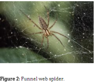 The Funnel Web Spider: Funnel weaver spiders (Agelenidae) This type of spider is the most common. We will find in our homes and they are particularly present during late summer and early fall. Don’t worry! Funnel web spiders are harmless. Their appearance is often misstaken them for a brown recluse. The funnel weaver just produces dense mats of silk on shrubs, thick grass, and in the corners of your home.