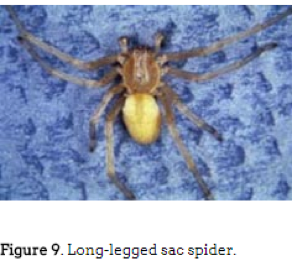 The Long Legged Sac Spider: Yellow sac spiders (Miturgidae)This specific sac spider is an active hunter. It is usually pale in color and can be found wandering in your home at night. Sac spiders spend daylight hours in a flattened silken sac, which they create in a room’s upper corner, or in wall cracks.
