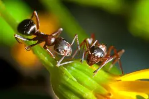 Two ants are working on yellow flower. Macro view. Close-up photography