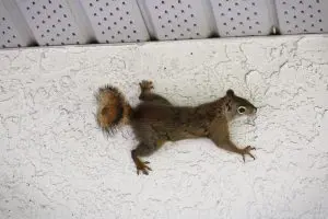 A squirrel of the side of a stucco wall.