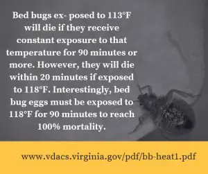 Temperatures are monitored from a remote location using wireless sensors ensuring heat levels are maintained at the lethal level. High temperature fans move the heated air throughout the space ensuring lethal levels reach cracks and crevices and high infestation zones. Following the heat application, technicians will also provide a chemical application in order to leave a lasting residual in place. There is good deal of preparation work that is needed for this service as well and the quality of the prep will also effect the success of the service. This service includes a 30 day follow up inspection and offers a 90-95% effective rate.